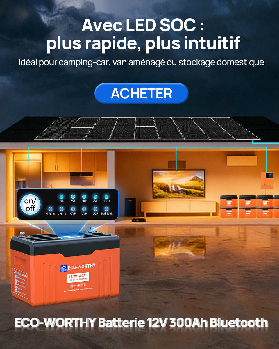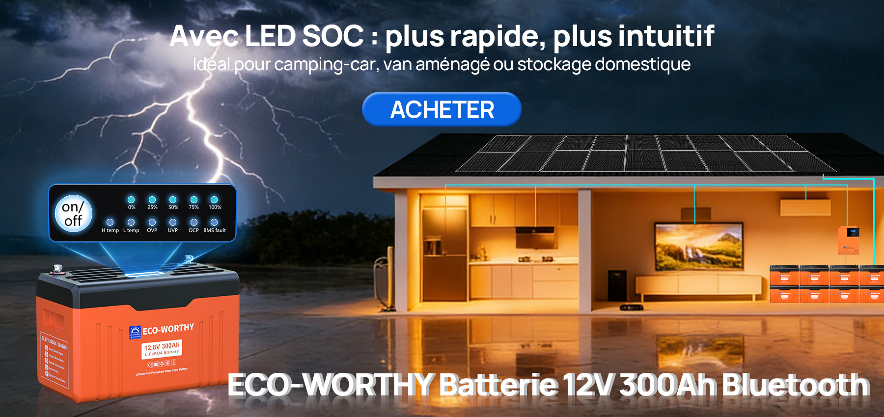 ECO-WORTHY Batterie Lithium 12V 300Ah LiFePO4 Bluetooth Avec Indicateur LED (Données SOC et Niveau de Batterie)