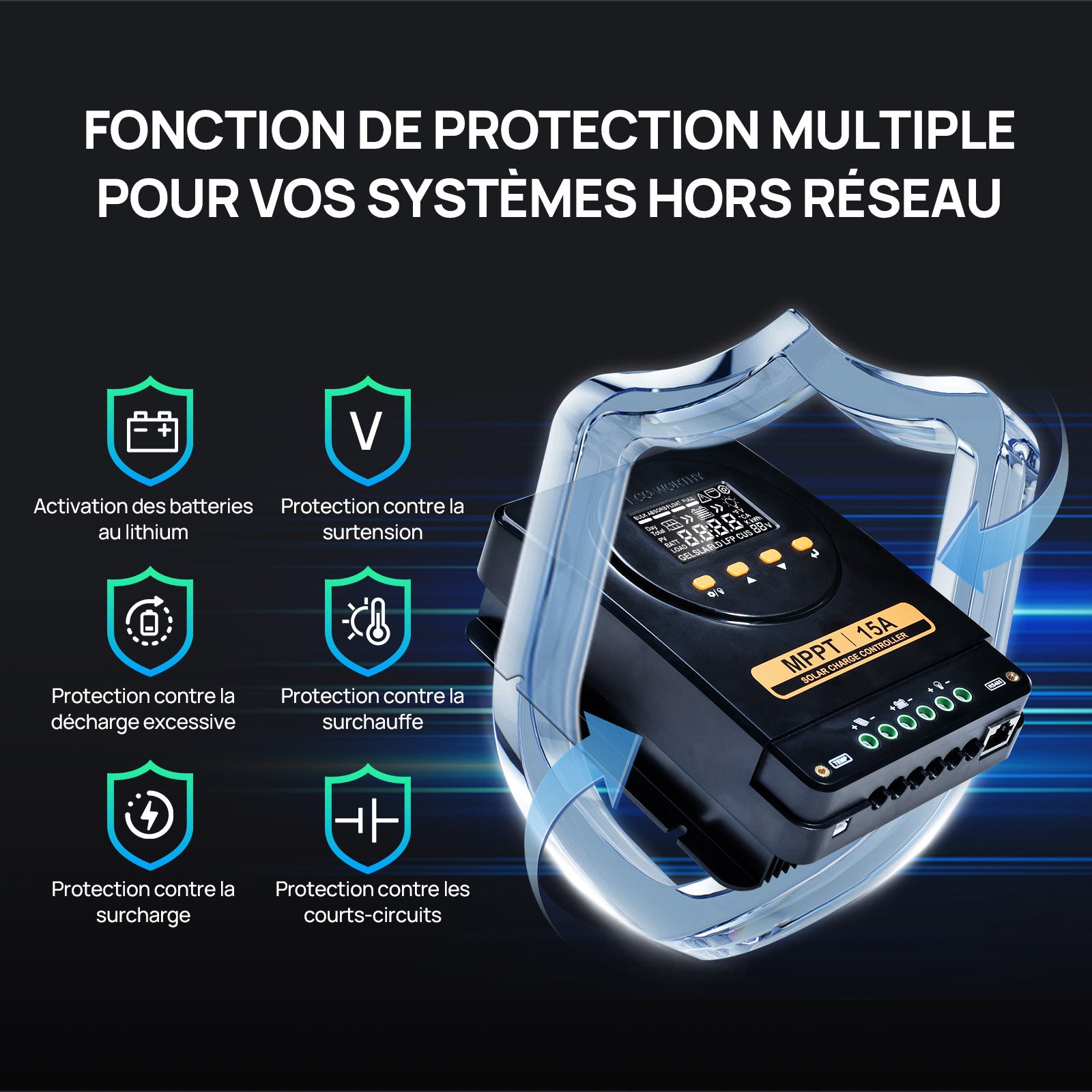 Le contrôleur MPPT 15A offre une protection complète contre la surcharge, la décharge excessive, les surintensités, les courts-circuits, les inversions de polarité et la surchauffe.