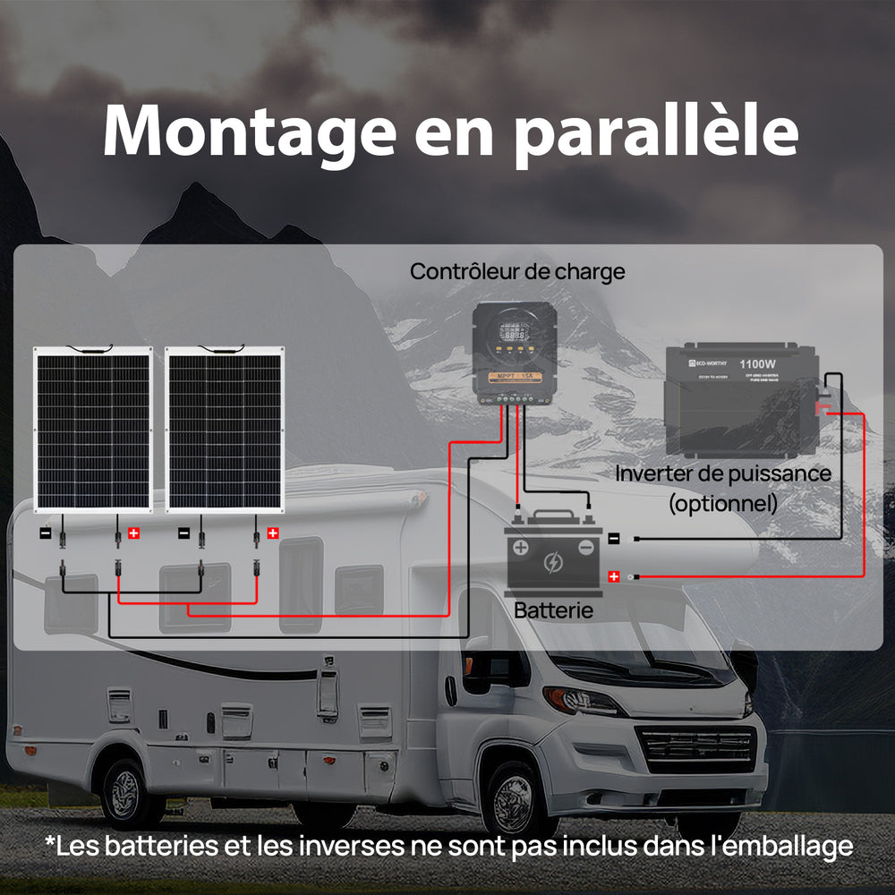 Large gamme d’applications: En plein soleil, le système peut produire jusqu’à 1,04 kWh d’énergie par jour (environ 4 heures d’exposition). Idéal pour charger les batteries 12V et alimenter vos camping-cars, bateaux, tentes et toitures, même sur des surfaces légèrement courbées.