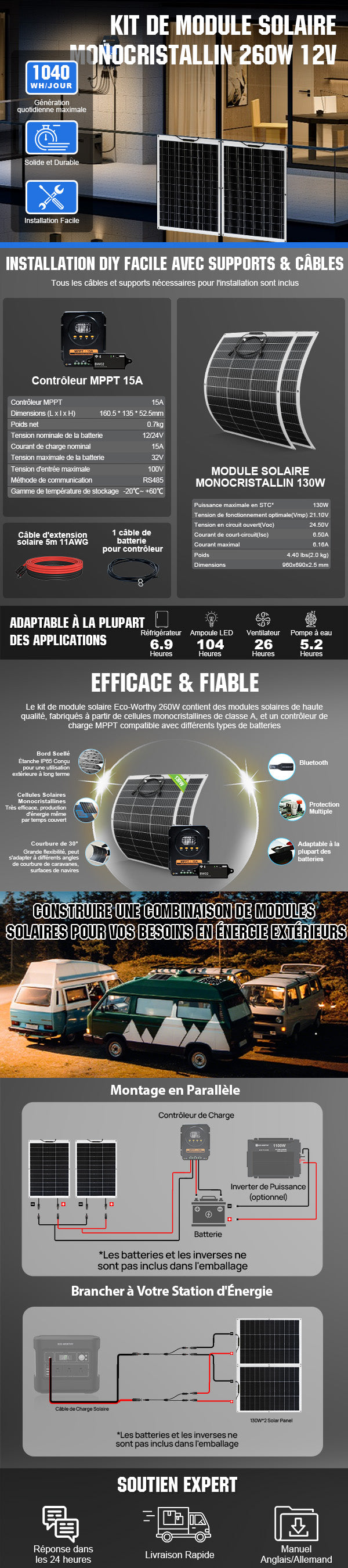 Kit solaire flexible ECO-WORTHY 260W pour systèmes 12V/24V, idéal pour camping-car, bateau et installation hors réseau. Composé de 2 panneaux solaires flexibles 130W en ETFE haute efficacité et d’un régulateur MPPT 15A avec écran LCD et communication RS485. Résistant, léger et facile à installer, ce kit offre une performance optimale même par faible luminosité. Compatible avec batteries LiFePO4, GEL, SLA, et plomb-acide. Parfait pour une alimentation autonome et durable.
