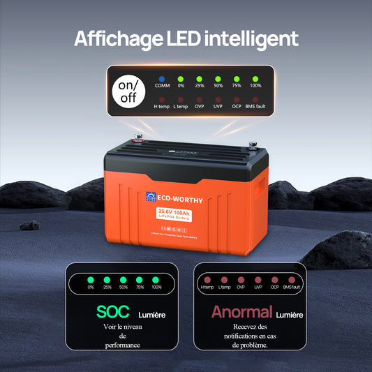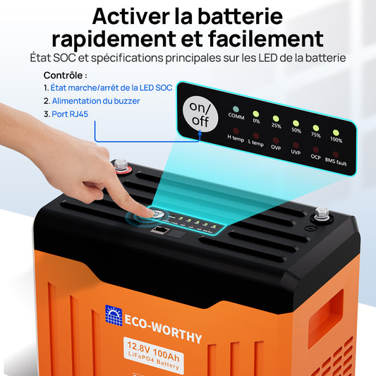 Batterie au lithium LiFePO4 12V100Ah Bluetooth et WIFI, Lumières LED SOC
