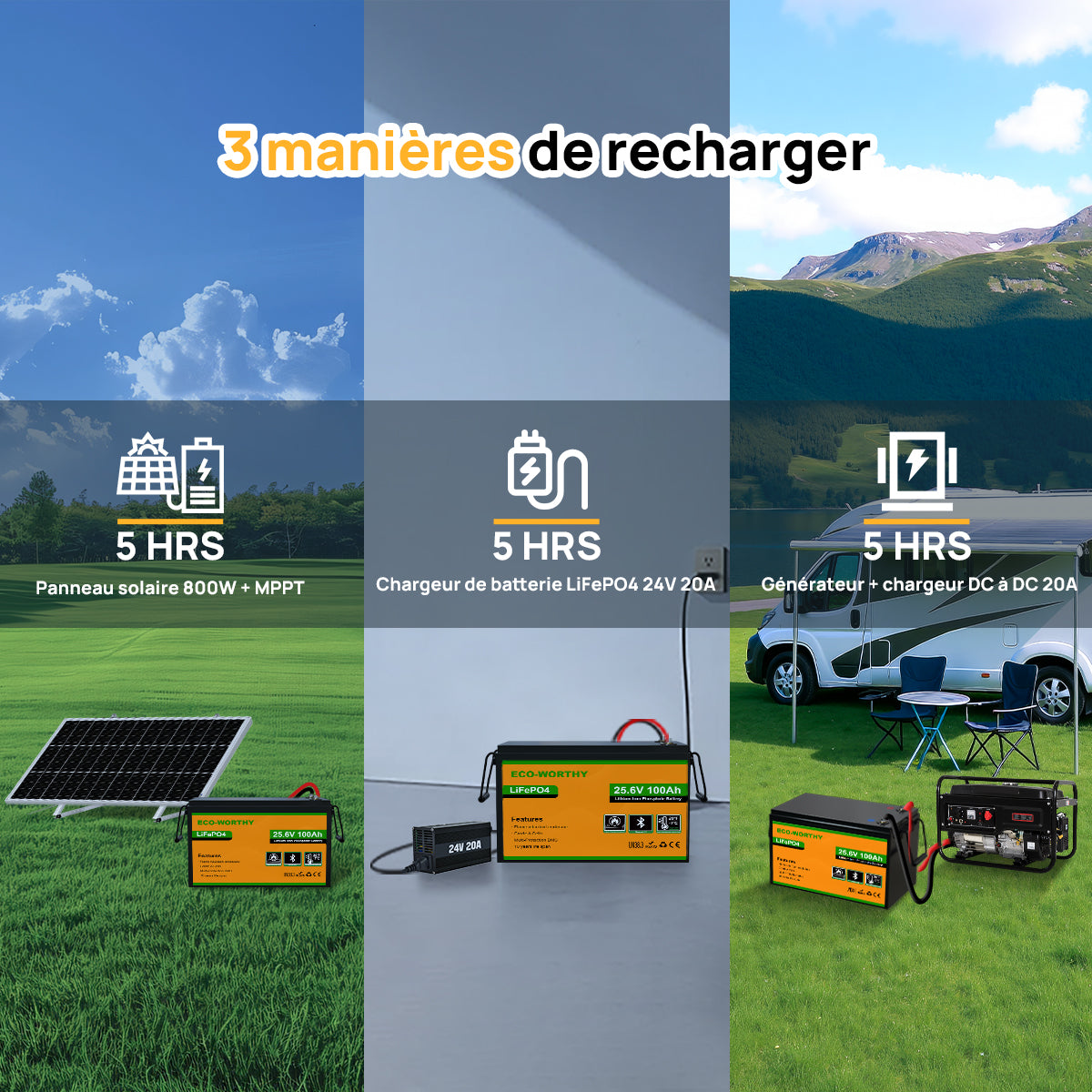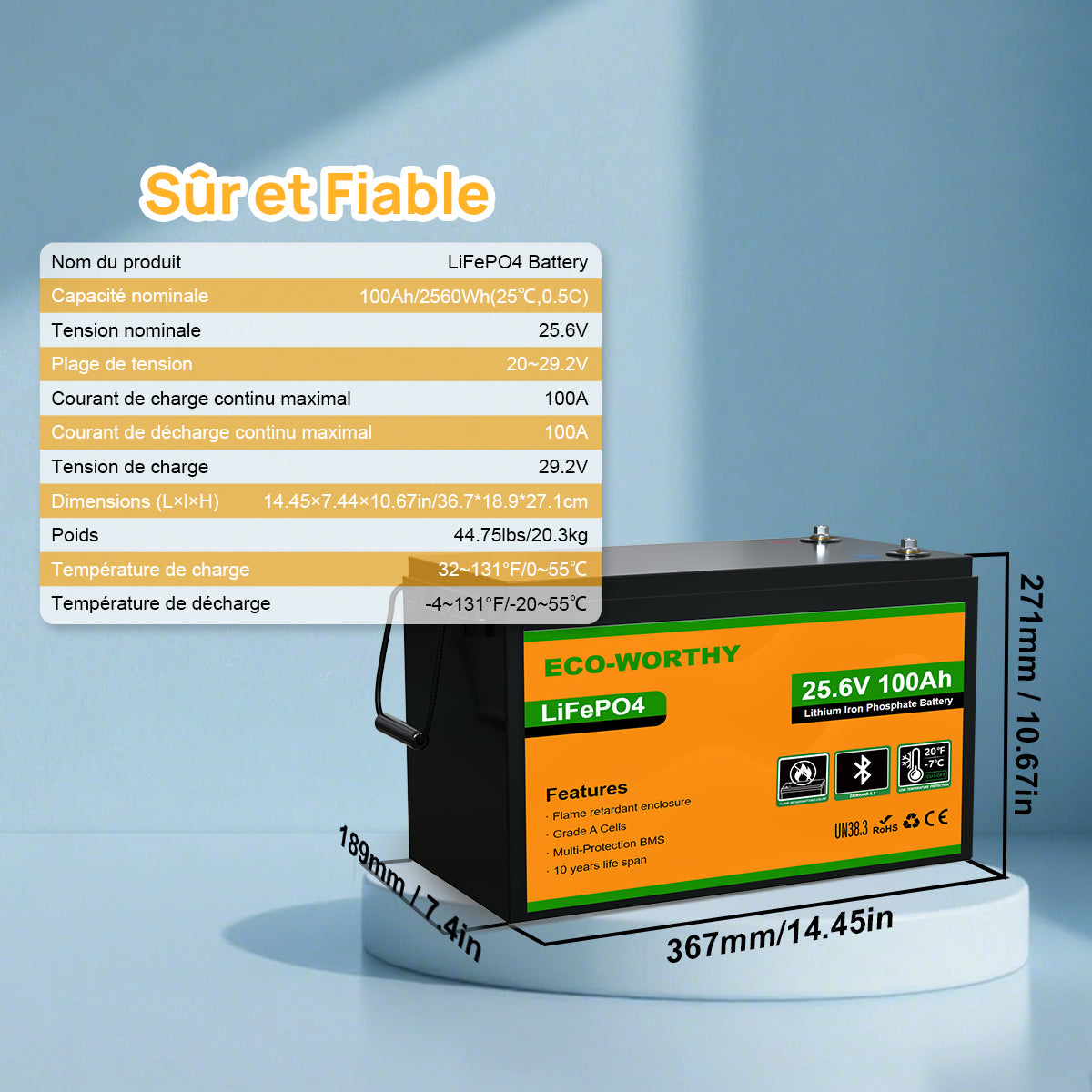 | Capacité de la batterie: 100Ah | Alimentation de la batterie: 2560Wh |