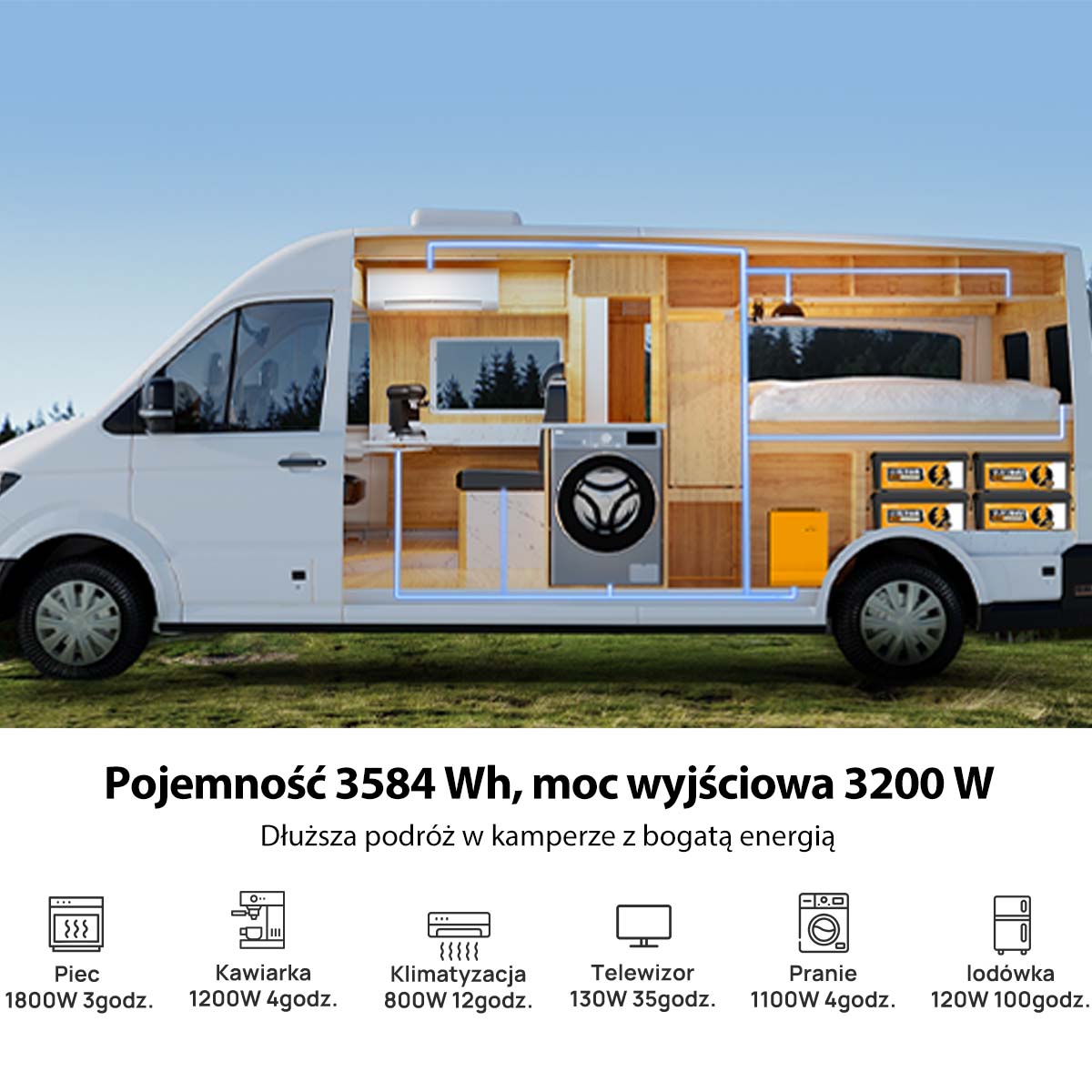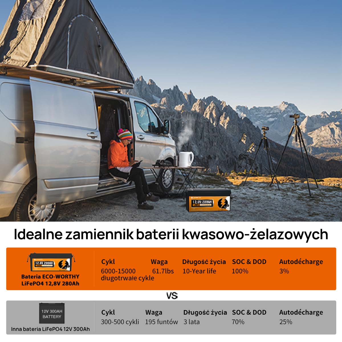 Duża pojemność i wysoka wydajność: użytecznej energii – z łatwością zasila lodówkę kempingową, ekspres do kawy, kuchenkę mikrofalową lub oświetlenie systemu solarnego. Ciągły prąd rozładowania 200A – idealny do kamperów, łodzi, generatorów i instalacji solarnych. Nie nadaje się jako akumulator rozruchowy do samochodów.
