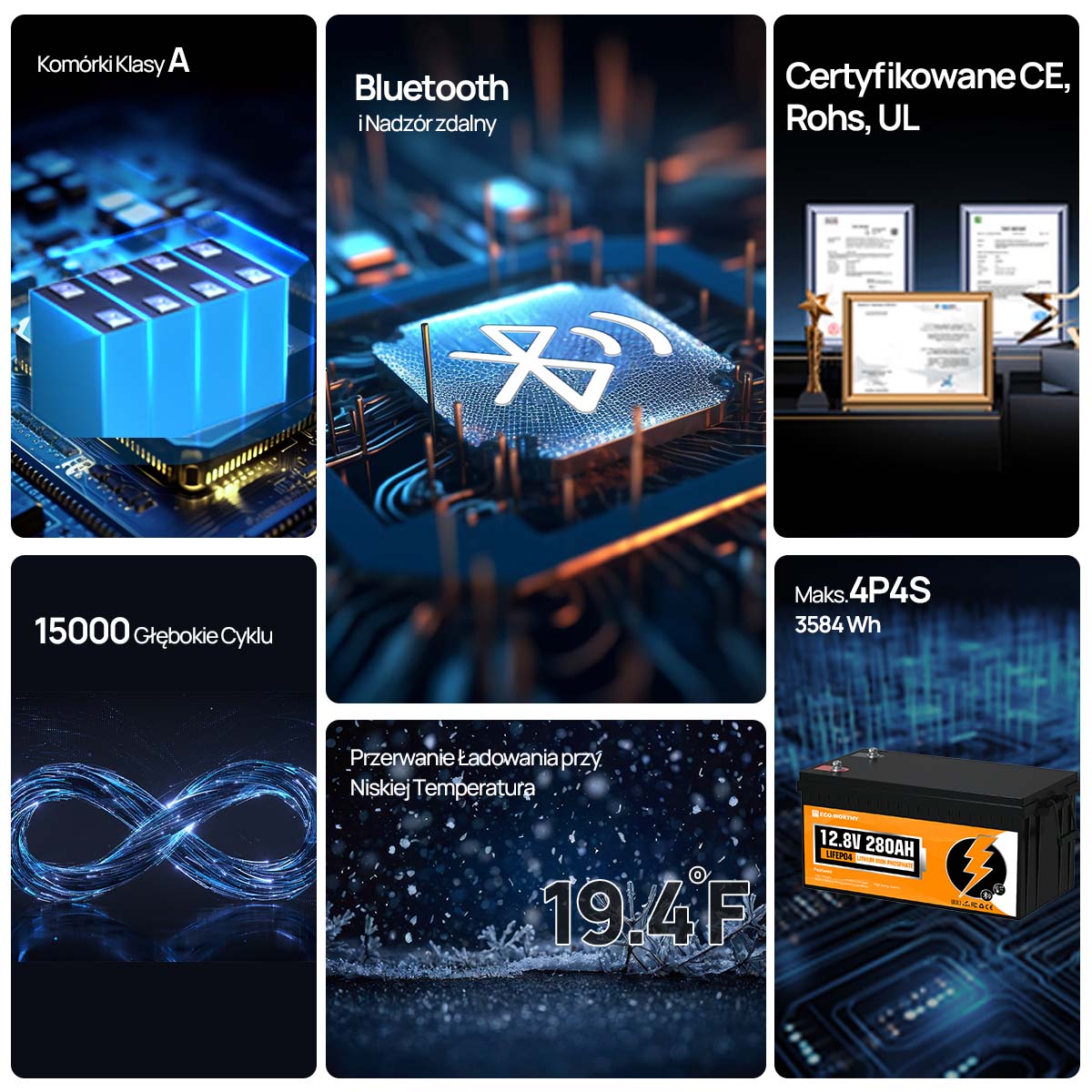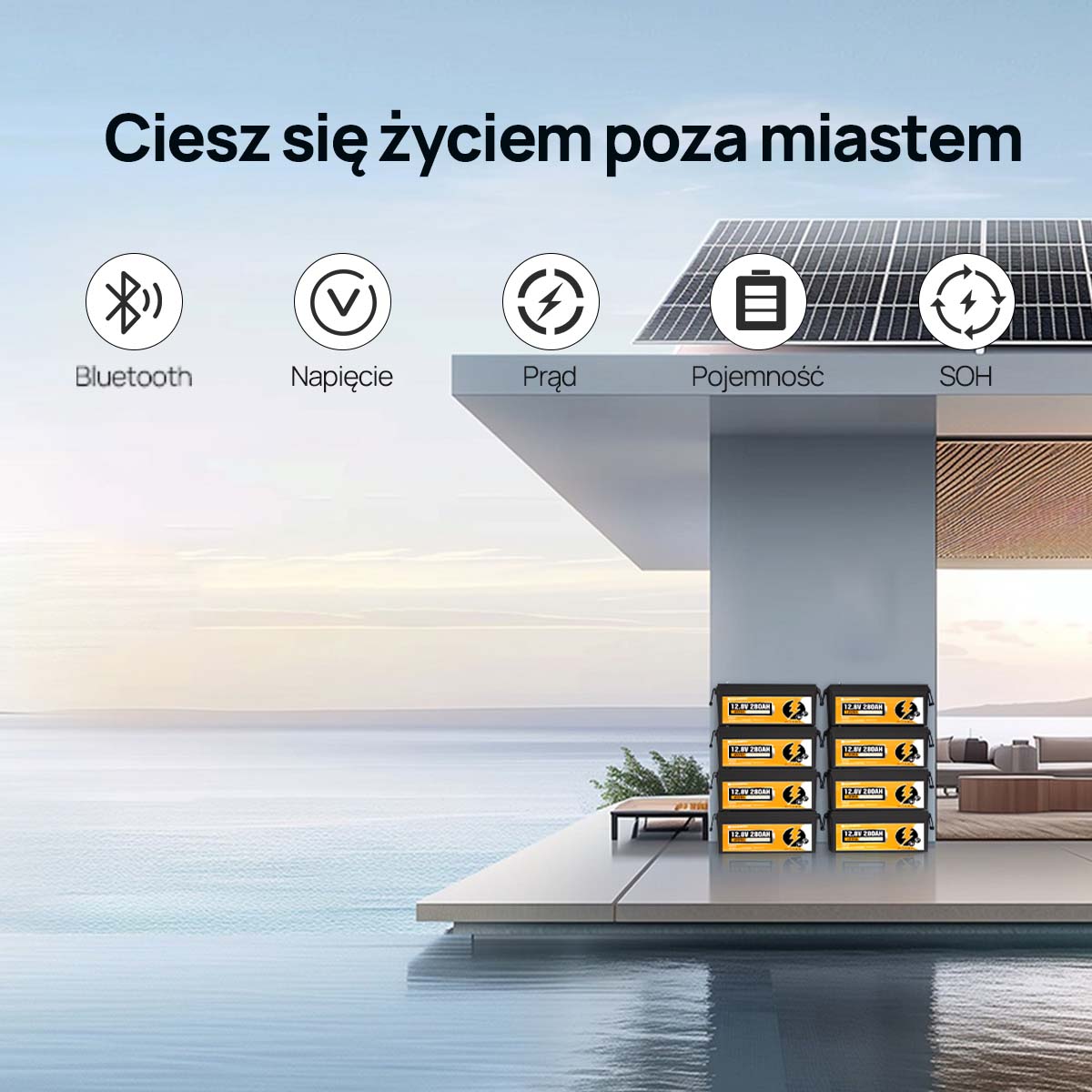 Bluetooth 5.1 – Inteligentne monitorowanie: Monitorowanie w czasie rzeczywistym przez aplikację mobilną: stan naładowania (SOC), napięcie, liczba cykli, temperatura i prąd. Precyzyjna kontrola pozwala przewidzieć zapotrzebowanie na energię i uniknąć awarii.