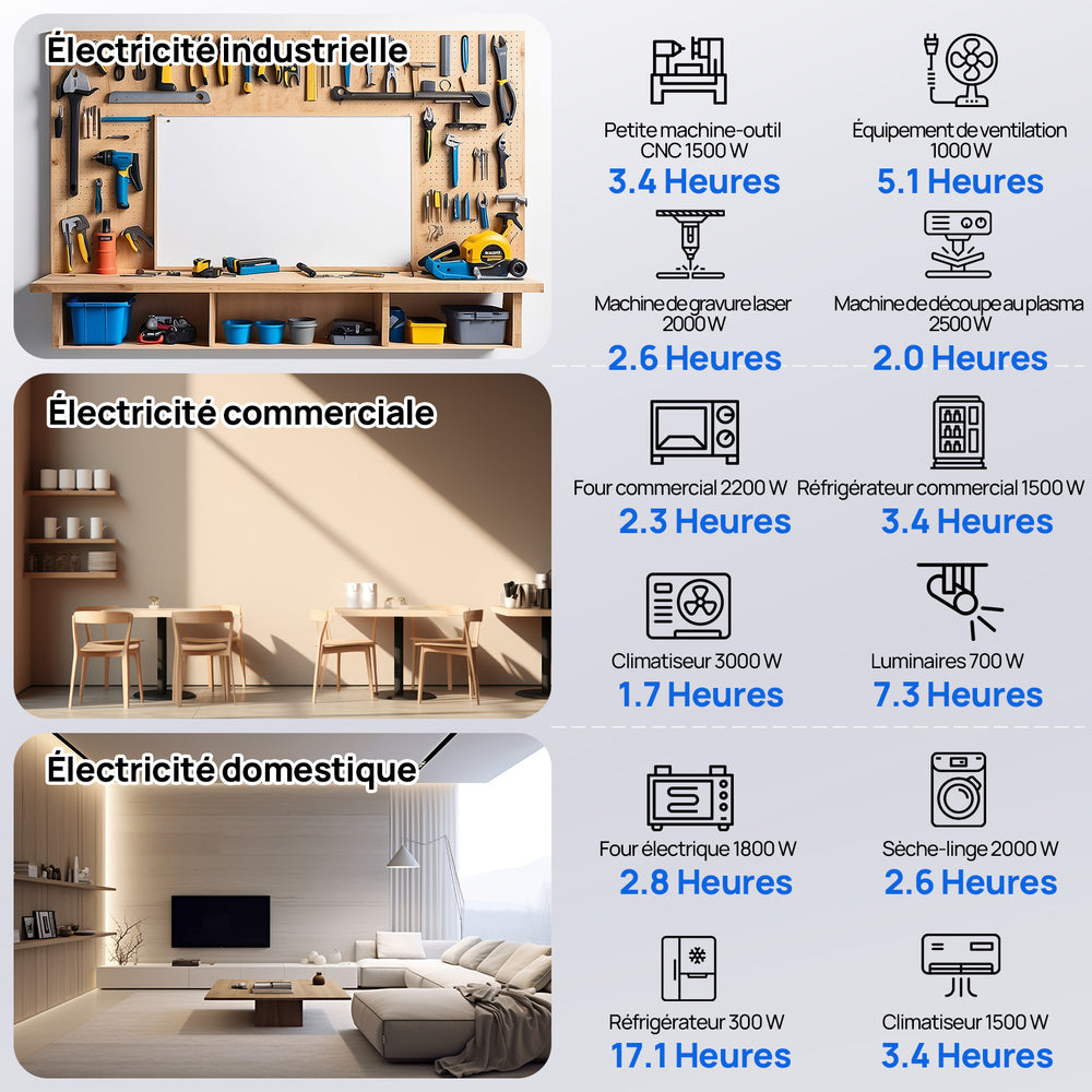 Si vous installez un espace photovoltaïque à la maison, vous pouvez donner la priorité à la batterie de la batterie en utilisant le système hors réseau. Vous pouvez également choisir de charger la batterie sur le réseau électrique CA. Vitesse de démarrage : jusqu'à 40 A pour le CA de démarrage, avec une charge complète en 2,5 heures ; jusqu'à 100 A pour la prise FV, avec une prise complète en 1 heure. Cela vous permettra d'avoir plus de vitesse avec une autre source d'énergie de secours de 5 kWh.