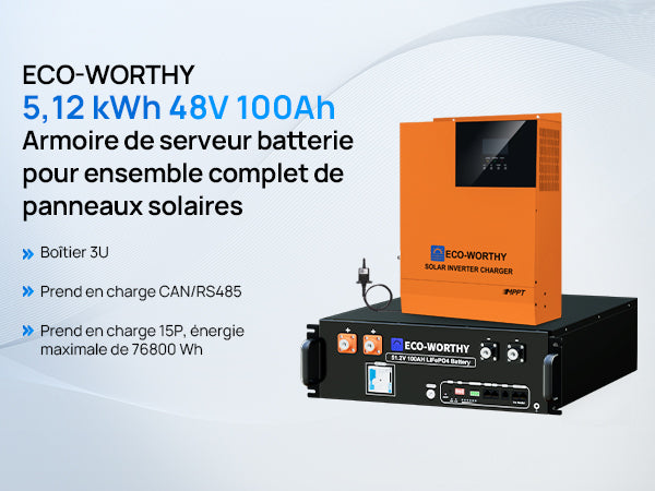 La batterie ECO-WORTHY LiFePO4 de 48 V (51,2 V) et 100 Ah est dotée de celle de niveau A, communication CAN/RS485 et surveillance Bluetooth/Wi-Fi. Inclut un involucro directement en métal, un BMS de 100 A et un interrupteur pneumatique de 125 A pour la sécurité. L'armadio 3U optionnel permet de partager l'espace.