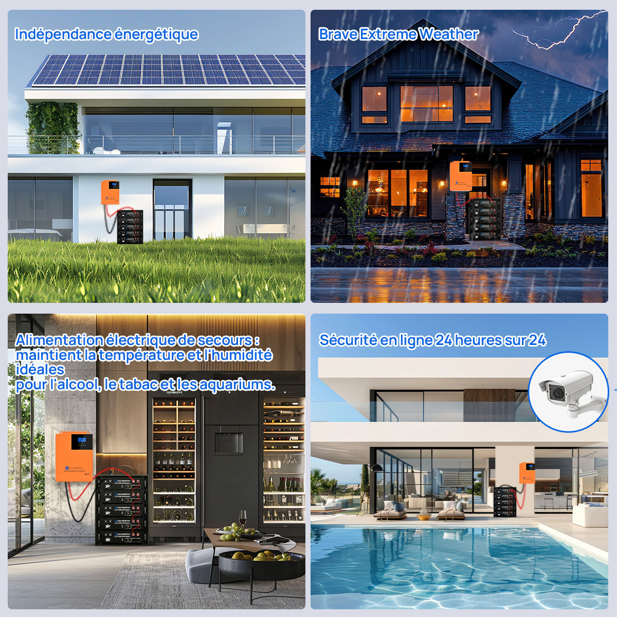 La configuration comprend un onduleur MPPT et une batterie due. Un onduleur prenant en charge 120 V et 240 V et a une puissance extraordinaire de 5000 W, permettant d'alimenter presque tous les appareils électriques domestiques avec plus de puissance. Pour une puissance plus grande, il est possible d'assembler en parallèle un 6 onduleurs hybrides pour obtenir 30 kW de puissance en CA. La batterie peut être collée en parallèle avec un grand nombre de 32 batteries pour étendre la capacité, soit 163.84 kWh d'accumulateur.