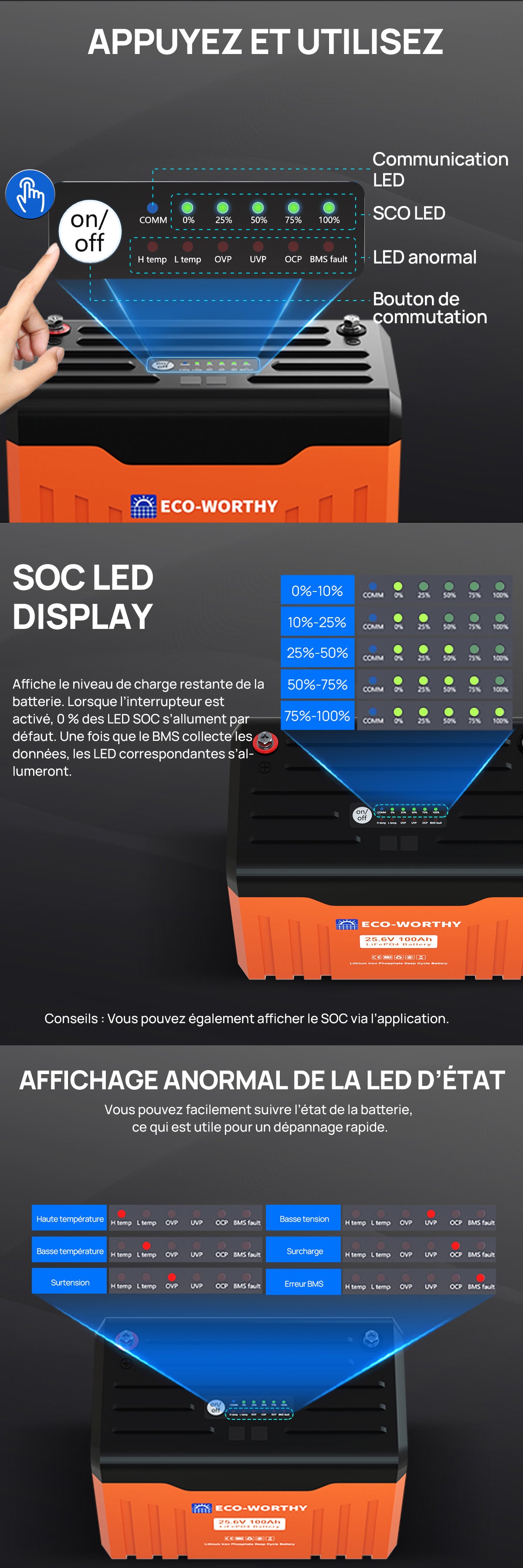 ·[ÉTAT DE LA BATTERIE ET PANNEAU D'AFFICHAGE SOC] : L'indicateur SOC affiche le niveau de charge de la batterie par étapes, tandis que la LED d'état permet une détection rapide des défauts. Allumez et éteignez le panneau LED en appuyant simplement sur un bouton