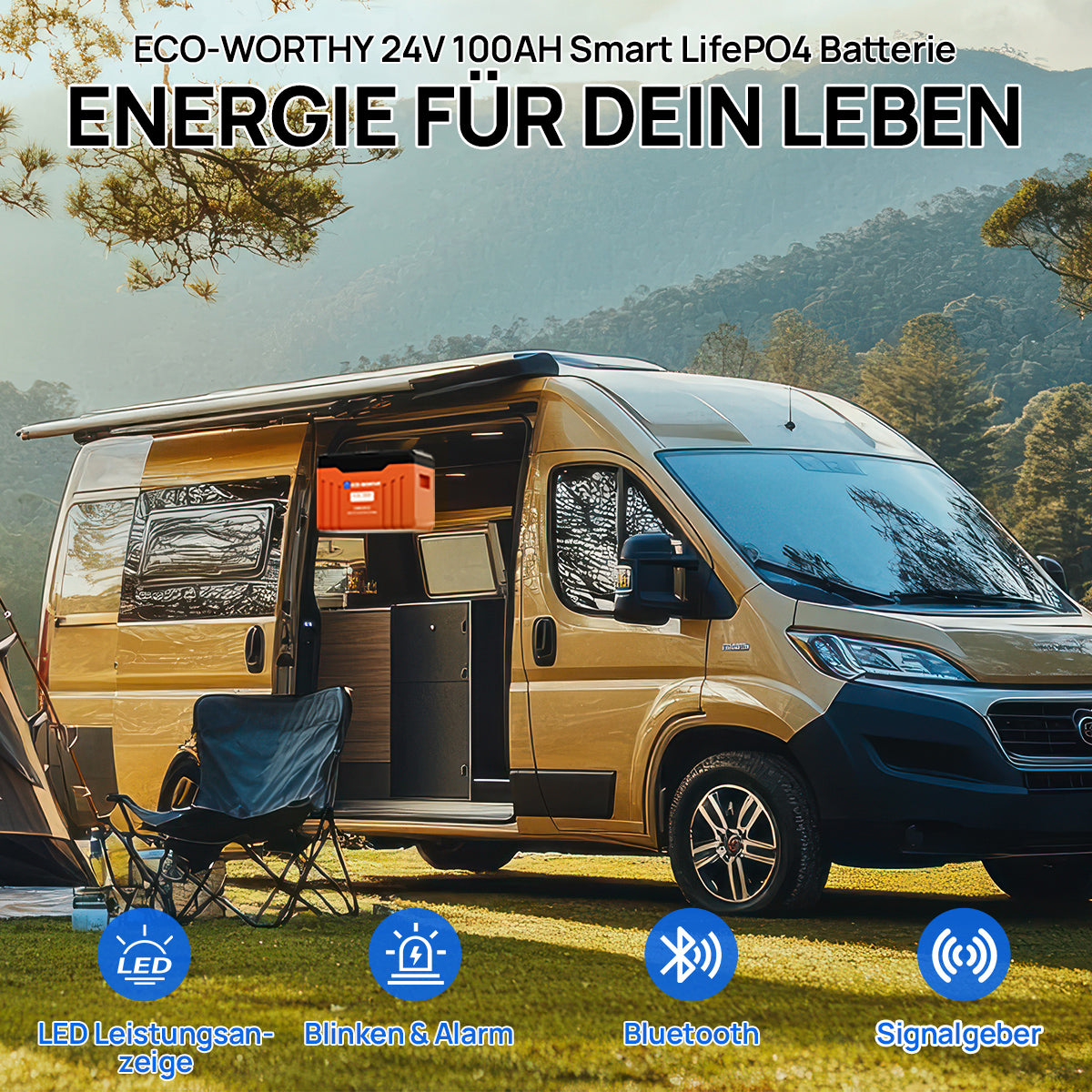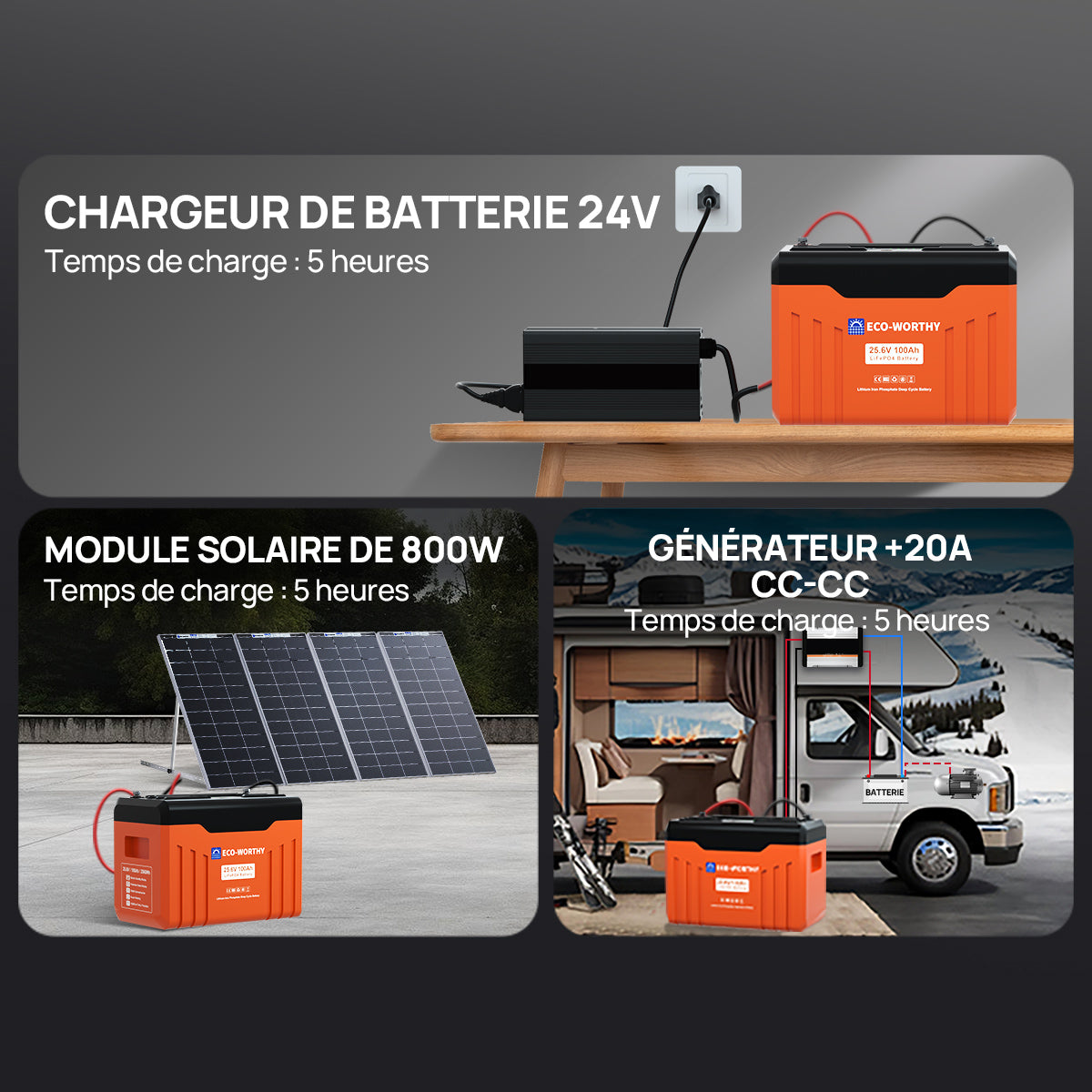 Batterie au lithium LiFePO4 24V 100Ah Bluetooth avec protection basse température, Lumières LED SOC, 100A BMS