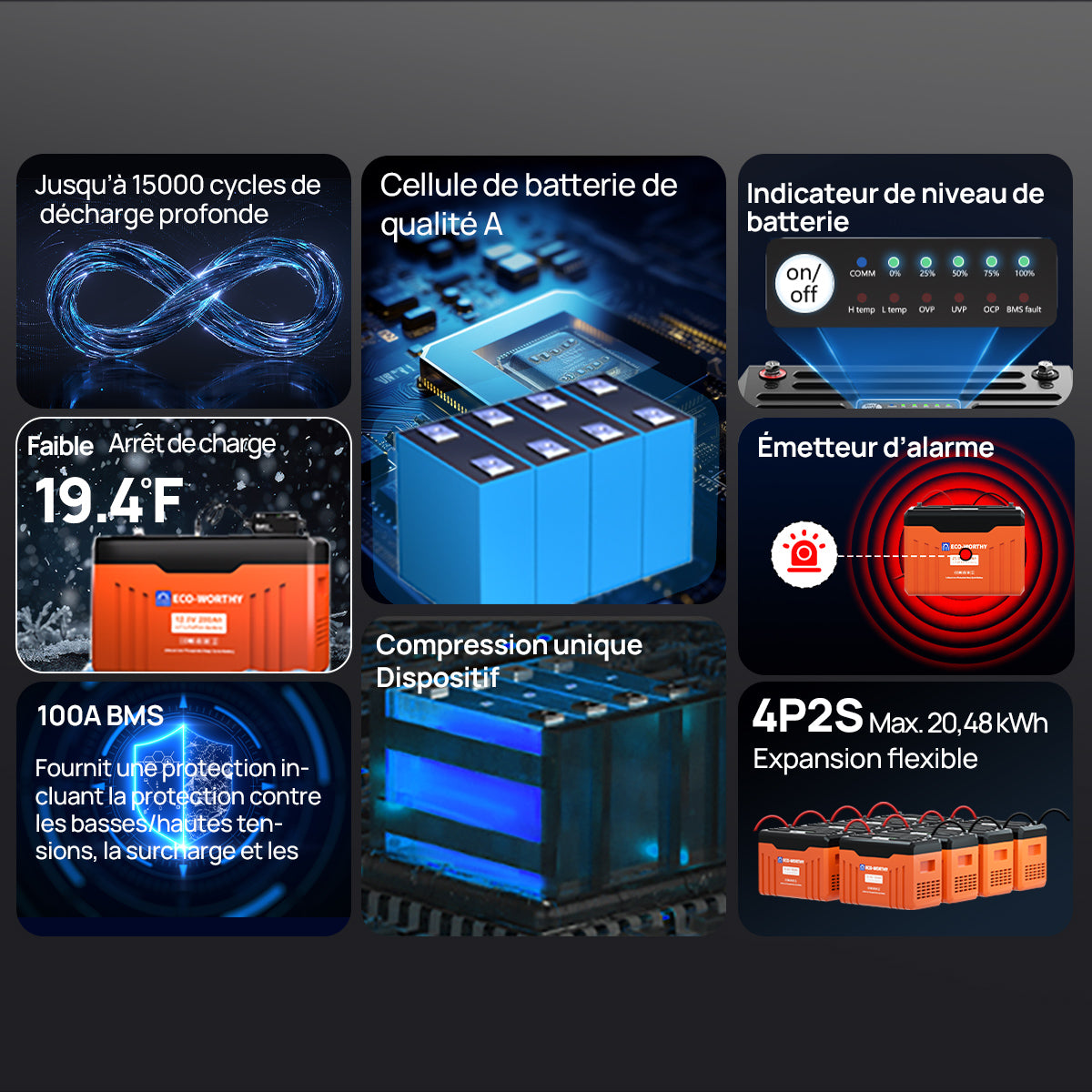 ·[Protections multiples BMS] : En plus de la protection contre la surchauffe, les surtensions et les surcharges, le BMS offre également une protection antigel. La charge s'arrête entre -12°C et -2°C et reprend automatiquement à 0°C.