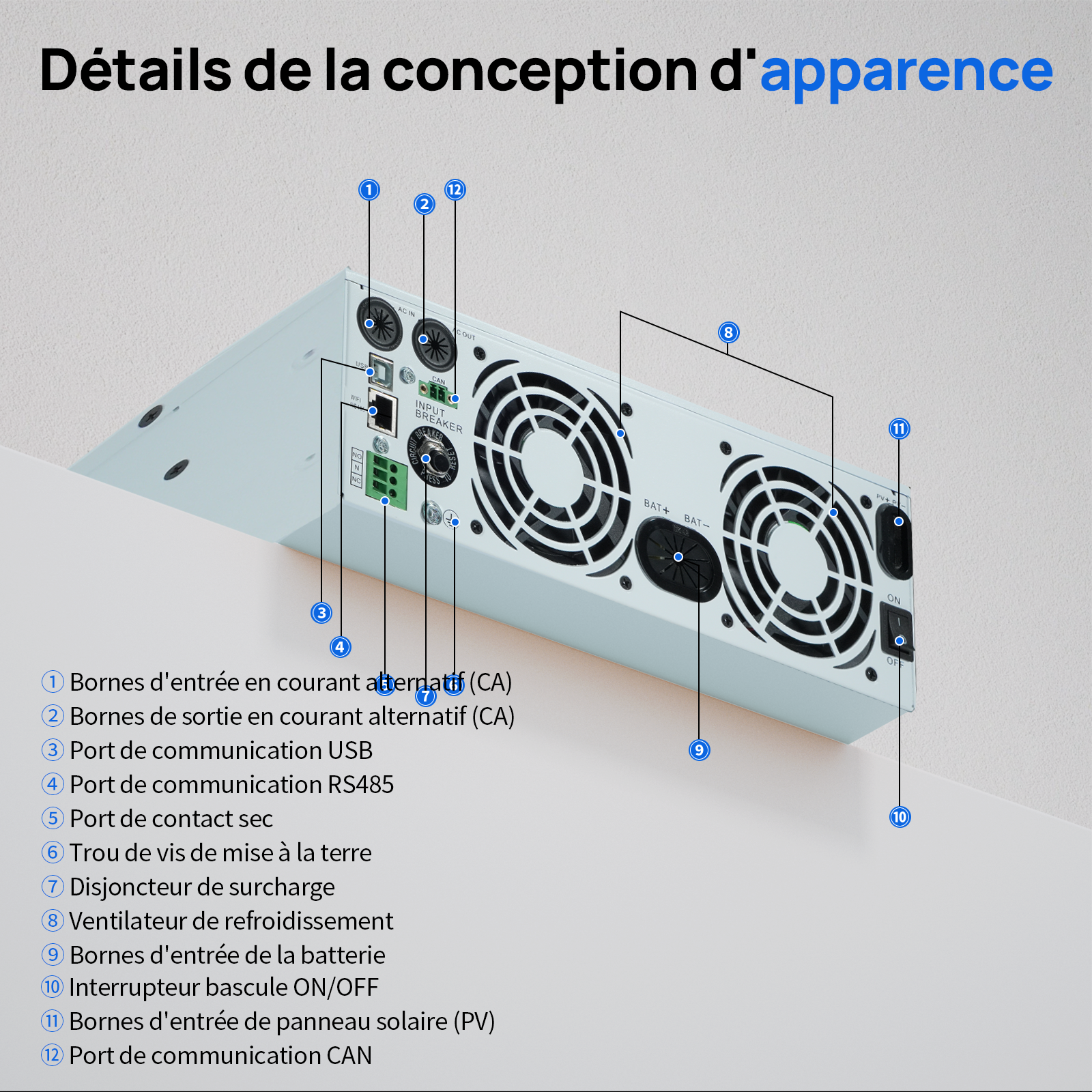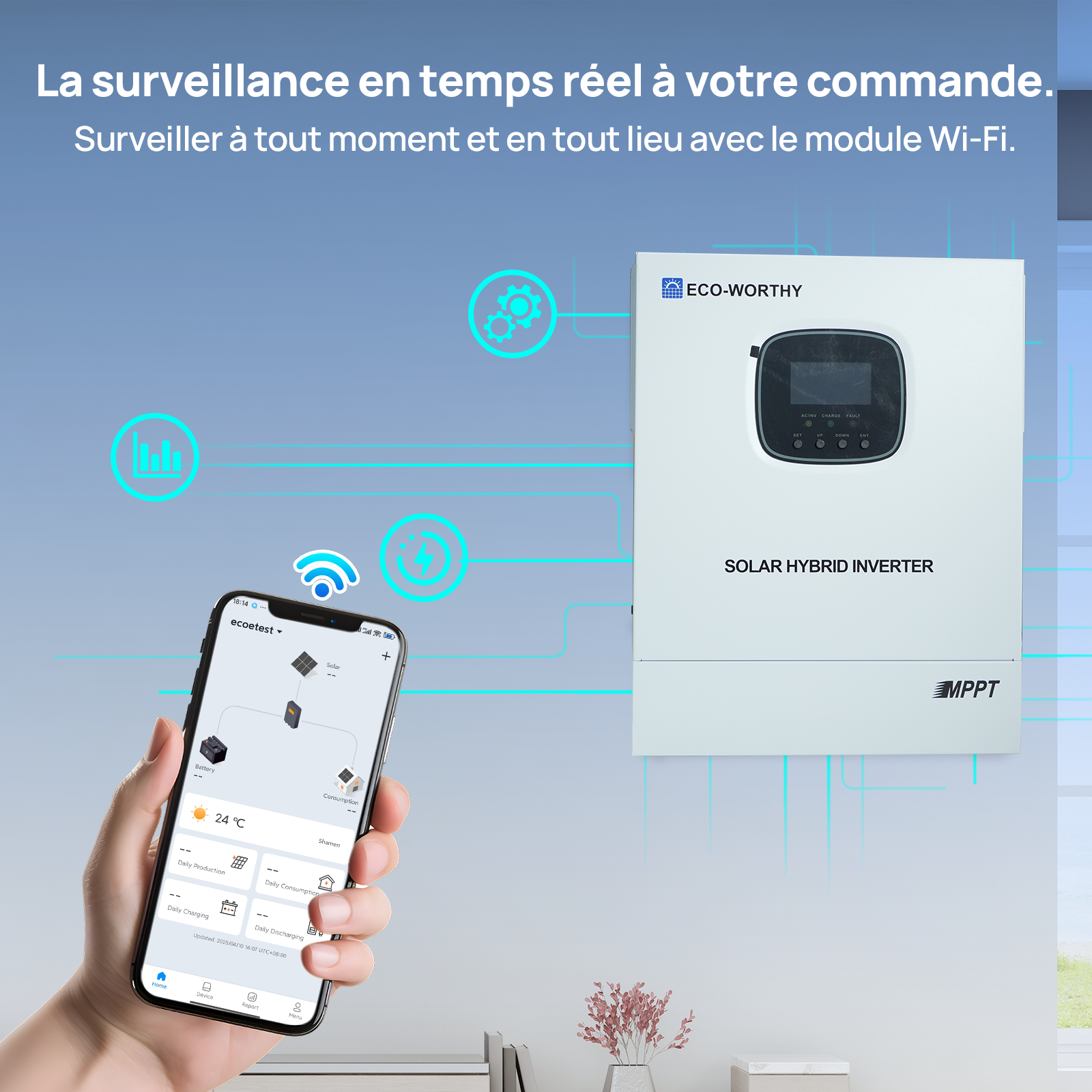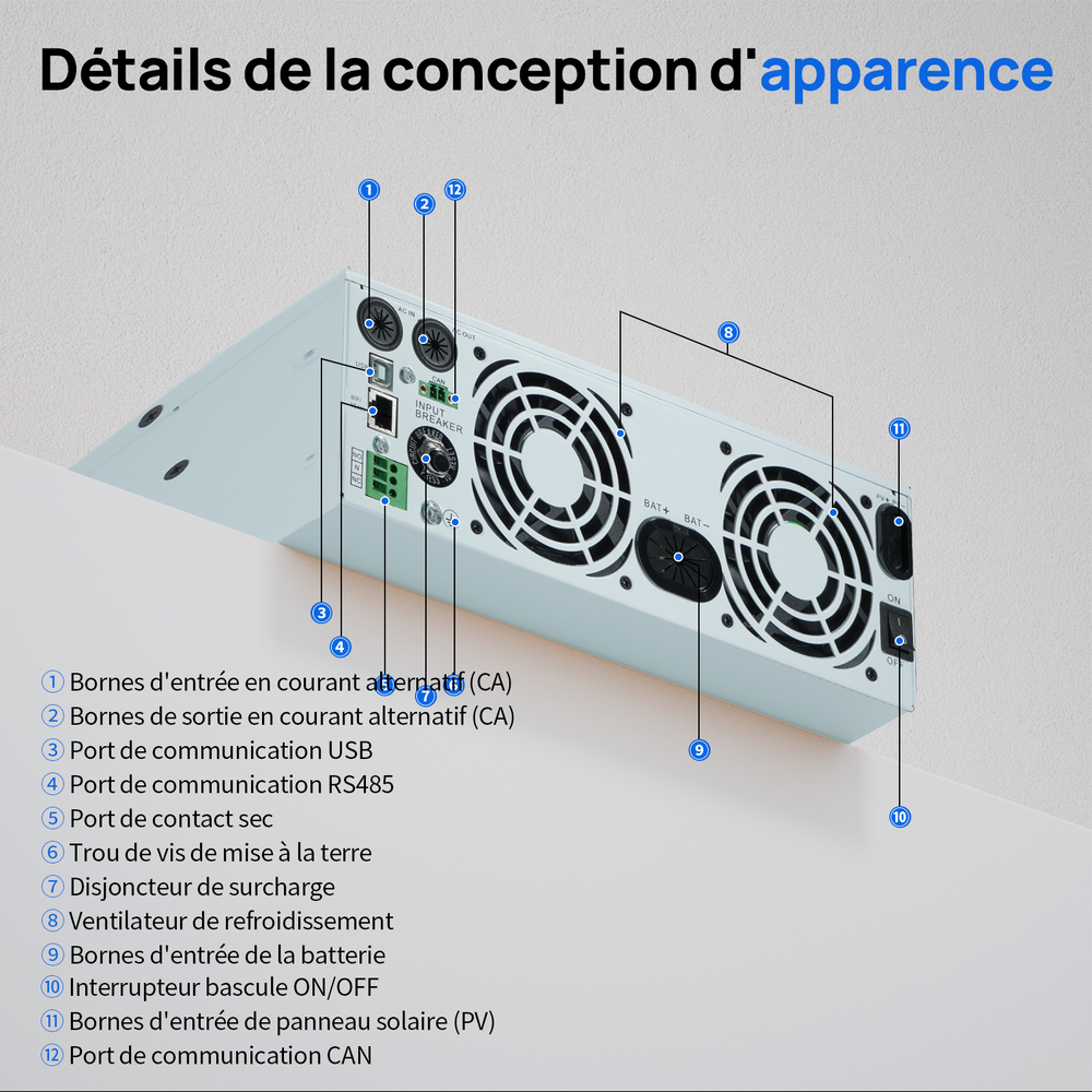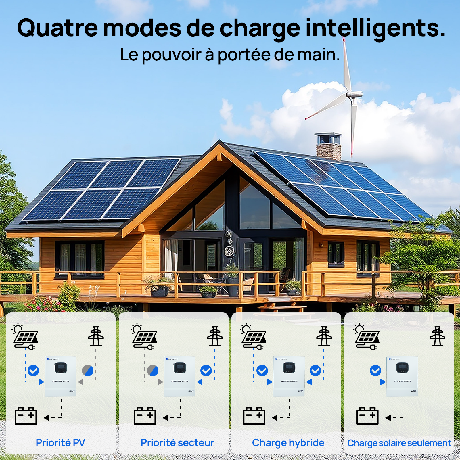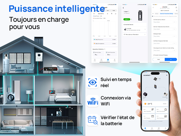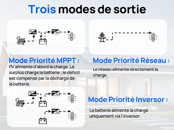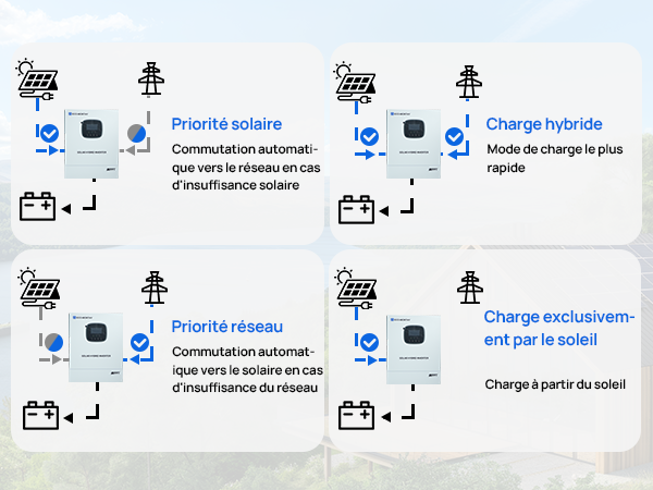 · Quatre modes de charge intelligents : solaire seul, priorité réseau, priorité solaire et hybride